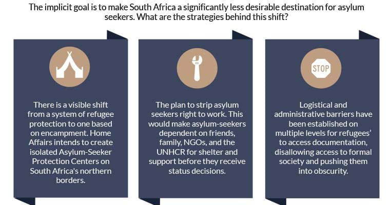 Four connected strategies are embedded in the 2016 Refugees Amendment Act, Green and White Papers, and other migration policy instruments, aiming to restrict rights, opportunities, and livelihood stability for refugees. The implicit goal is to make South Africa a significantly less desirable destination for asylum seekers.