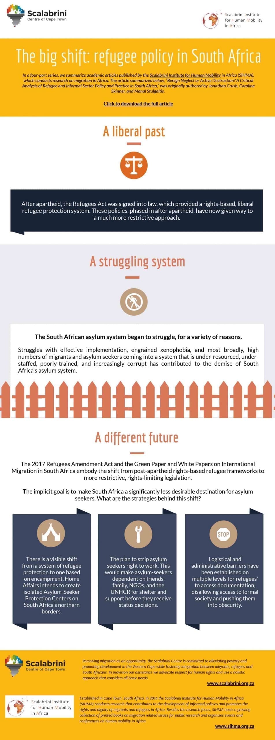 Drawing inputs from a variety of sources and 30 in-depth interviews with informants in Cape Town, Limpopo, and Gauteng, the authors identify the 2017 Refugees Amendment Act and the Green Paper and White Papers on International Migration in South Africa as embodiments of the shift from post-apartheid rights-based refugee frameworks to more restrictive, rights-limiting legislation. Over time, the rights-based policy reflected in the 1998 Refugees Act has eroded due to a combination of factors: struggles with effective and efficient implementation, the migration pressure brought by Zimbabwe’s 2007 economic collapse, engrained xenophobia among the public and policy makers, and most broadly, high numbers of migrants and asylum seekers coming into a system that is under-resourced, under-staffed, poorly-trained, and increasingly corrupt.